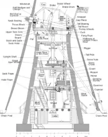The rotating assembly of stocks, sails, windshaft, brake wheel etc. is supported on two bearings. The neck bearing supports by far the largest fraction of the weight. This is a plain bearing which supports the majority of the vertical component of the weight of the rotating assembly. The bearing block is of solid brass construction and is lubricated with animal fat. The shaft lays in a shallow groove of the neck bearing block and is kept in position by the weight of the rotating assembly. The tail bearing supports the remainder of the vertical weight and any (horizontal) thrust generated by the wind. The neck bearing does not react to any thrust forces.