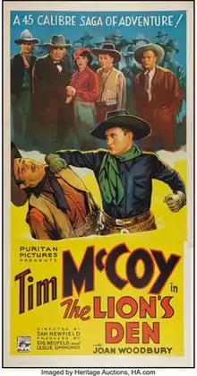 The Lion's Den is a 1936 American western film directed by Sam Newfield and starring Tim McCoy, Joan Woodbury and Don Barclay.[1]