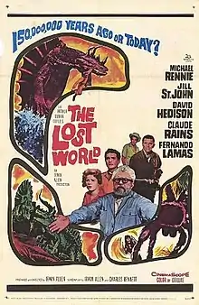 The Lost World is a 1960 De Luxe Color and CinemaScope fantasy adventure film directed by Irwin Allen and loosely based on the 1912 novel of the same name by Arthur Conan Doyle. The plot of the film revolves around the exploration of a plateau in Venezuela inhabited by cannibals, dinosaurs, carnivorous plants, and giant spiders. The cast includes Claude Rains, David Hedison, Fernando Lamas, Jill St. John, and Michael Rennie.