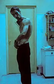 Christian Bale strenuously dieted for over four months prior to filming, as his character needed to look drastically thin. According to a biography of Bale written by his former assistant, this daily diet consisted of "water, an apple and one cup of coffee per day, with the occasional whiskey" (approximately 55–260 calories).[6] According to the DVD commentary, he lost 62 pounds (28 kg), reducing his body weight to 120 pounds (54 kg). Bale wanted to continue down to 99 pounds (45 kg), but the filmmakers would not allow it due to health concerns. In fact, the target weight to which the 6 ft (183 cm) Bale dropped was intended for a much shorter actor, but Bale insisted on seeing if he could make it anyway.[7] At the end of filming he was left with just six weeks to regain enough mass to be ready for the screen test for his role in Batman Begins, which he achieved through weightlifting and binging on pizzas and ice cream.[8]