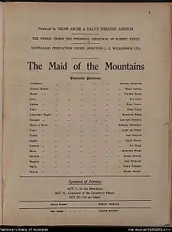 Produced by Robert Evett (after being turned down by Frank Curzon) and directed by Oscar Asche (who had directed the record-setting hit Chu Chin Chow), The Maid of the Mountains ran for 1,352 performances in its initial London run – closing mainly because of the nervous exhaustion of its female lead, José Collins. This highly profitable run saved the George Edwardes estate, then being managed by Evett, from bankruptcy.[1]
