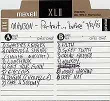 ![]() Hitachi Maxell re-recordable cassette cover, featuring the album's track listing handwritten by the band's guitarist, Daisy Berkowitz. | ||||
