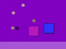 The player interacts using only mouse movement, hovering over abstract shapes. The player's actions or inaction enlarge or shrink pink and blue squares, increase or decrease their opacity, and move them towards or away from each other.[2][3] Placing the cursor over either of the squares causes the blue square to shrink, and for the squares to move towards each other. Moving the cursor over a circle makes the circle disappear, while at the same time reducing the size of the pink square. If the two squares "kiss" by touching edges, the sizes and transparency are affected inversely: the blue square shrinks and becomes more transparent; the pink square grows and becomes more opaque. When the blue square comes in contact with circles of any color other than black, it grows and becomes more opaque. When the pink square comes in contact with circles of any color other than black, it grows but transparency does not change. When either square collides with a black circle, its size decreases. As squares collide with each other or with circles, a light bar at the bottom of the screen grows in size. Over time, the pink square steadily increases its transparency unless counteracted by touching edges with the blue square.[2][4]