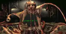 When the player engages the Master near the end of the game, they can confront the Master with a number of different skills and approaches.[9] The player can enter combat with the Master and his Super Mutant allies. The player can also convince the Master to abandon his plans by revealing to him that Super Mutants are sterile, a revelation that causes the Master to commit suicide. Skipping the confrontation entirely, the player can sneak into his chambers and find a hidden nuclear arsenal that can blow up the cathedral, killing the Master.[6] The player also has the option of joining the Master's campaign, which will lead to a bad ending in which Vault 13 is raided by Super Mutants.[10][11] If the player character has a low enough intelligence, they will only be able to call the Master ugly, resulting in the Master believing that even the F.E.V. would not help the player character.[10]