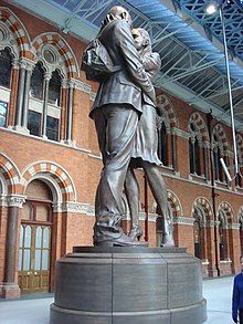 The Meeting Place is a 9-metre-high (30 ft), 20-tonne (20-long-ton) bronze sculpture that stands at the south end of the upper level of St Pancras railway station. Designed by the British artist Paul Day and unveiled in 2007, it is intended to evoke the romance of travel through the depiction of a couple locked in an amorous embrace.[1]