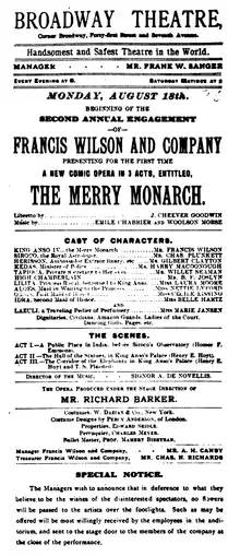 Presented by actor-manager Francis Wilson and his company, which also featured Marie Jansen, The Merry Monarch debuted on August 18, 1890, and ran for 49 performances, through October 4. Though this was not considered a long run for the time, the show was turning large profits, and crowds were being turned away from every performance. The New York Times reported on September 29 that the opera was sure to gross at least $87,000 during the run, "the largest amount by many thousands ever taken at the theatre in the same period at regular prices."[4] But the theatre had other contractual engagements that prevented a longer run,[5] and it was announced that the production would return the following fall. The opera immediately went on the road, also playing to packed houses.[6][7][8] The play returned after the long run of Wang concluded, and ran from October 5 through December 26, 1891, for 84 more performances. On the second run, a young Lulu Glaser served as the understudy for star Marie Jansen.[3] It may have run longer, but Wilson was anxious to bring out his next piece, The Lion Tamer, which immediately followed.