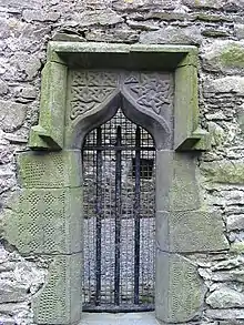 The ground and first storey ogee windows (five in total) face onto the street, with carvings of a horse, a bust of a man, a bird, a snake and Celtic interlace ornament which reflects a revival of interest in Celtic art in the 15th–16th centuries. They also have hood mouldings and mullions.[8][9][10][11][12][13]