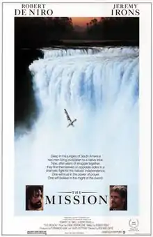 The Mission is a 1986 British period drama film about the experiences of a Jesuit missionary in 18th-century South America.[4] Directed by Roland Joffé and written by Robert Bolt, the film stars Robert De Niro, Jeremy Irons, Ray McAnally, Aidan Quinn, Cherie Lunghi, and Liam Neeson.