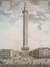 The first Rebuilding Act, passed in 1669, stipulated that "the better to preserve the memory of this dreadful visitation", a column of either brass or stone should be set up on Fish Street Hill, on or near the site of Farynor's bakery, where the fire began. Christopher Wren, as surveyor-general of the King's Works, was asked to submit a design. Wren worked with Robert Hooke on the design. It is impossible to know the extent of the collaboration between Hooke and Wren, but Hooke's drawings of possible designs for the column still exist, with Wren's signature on them indicating his approval of the drawings rather than their authorship.[6] It was not until 1671 that the City Council approved the design, and it took six years to complete the 202 ft (62 m) column. It was two more years before the inscription (which had been left to Wren—or to Wren's choice—to decide upon) was set in place. "Commemorating—with a brazen disregard for the truth—the fact that 'London rises again...three short years complete that which was considered the work of ages.'"[7]