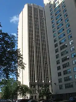 The Narragansett is a historic apartment building at 1640 E. 50th Street in the Kenwood neighborhood of Chicago, Illinois. The building was built in 1928 at the peak of apartment construction in Chicago, as apartments had grown in popularity throughout the early 20th century. It was one of several apartments built in the Chicago Beach Development, a lakefront property that was developed into a fashionable neighborhood known as Indian Village. Architects Leichenko and Esser designed the Art Deco building. The 22-story building features brick piers spanning its entire height, terra cotta spandrels dividing each floor, and decorative limestone on the first three floors.[2]