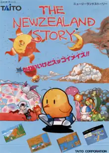 The NewZealand Story (ニュージーランドストーリー, Nyū Jīrando Sutōrī) is a platformer arcade game developed and published by Taito in 1988. The game's concept and setting were inspired by a holiday trip in New Zealand by one of the Taito programmers. The player controls Tiki (ティキ), a kiwi who must save his girlfriend Phee Phee (ピューピュー) and several of his other kiwi chick friends who have been kidnapped by a large blue leopard seal. While avoiding enemies, the player has to navigate a scrolling maze-like level, at the end of which they release one of Tiki's kiwi chick friends trapped in a cage.[3] In 2007, the arcade game received a remake for the Nintendo DS under the title New Zealand Story Revolution.