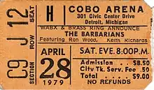 The New Barbarians debuted as the Rolling Stones' support act at two charity concerts to benefit the CNIB at the Oshawa Civic Auditorium near Toronto, Ontario on 22 April 1979, fulfilling one of the conditions of Richards' 1978 sentence for possession of heroin.[4] The band's eighteen-gig US tour followed. They made news in Milwaukee, Wisconsin when fans rioted, apparently due to their expectation that the show would feature "special guests", who did not appear.[2]
