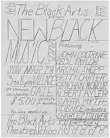 Baraka booked a March 28 concert under the name "New Black Music" for the benefit of BARTS, and also arranged for it to be recorded.[2] A poster for the concert advertised $5 tickets and listed the participants as John Coltrane, Cecil Taylor, Archie Shepp, Betty Carter, Grachan Moncur, Albert Ayler, the Sun Ra Myth-Science Arkestra, and Charles Tolliver.[5] Baraka recalled:[6]