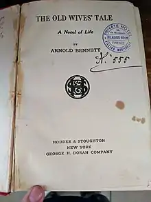 The Old Wives' Tale is a novel by Arnold Bennett, first published in 1908. It deals with the lives of two very different sisters, Constance and Sophia Baines, following their stories from their youth, working in their mother's draper's shop, into old age. It covers a period of about 70 years from roughly 1840 to 1905, and is set in Burslem and Paris. It is generally regarded as one of Bennett's finest works.