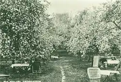 The history of The Orchard started in 1897 (the orchard itself was first planted in 1868) when a group of Cambridge students asked the landlady, Mrs Stevenson of Orchard House, if they could take their tea in the orchard rather than on the front lawn as the custom was. This practice soon became the norm, and the place grew in popularity. The next phase in the history of The Orchard began when the poet Rupert Brooke took up lodging in the house in 1909. A graduate student of great popularity in the university community at the time, Brooke soon attracted a great following at the place, among them Virginia Woolf, John Maynard Keynes, E.M. Forster, Bertrand Russell, Augustus John, and Ludwig Wittgenstein – the so-called Grantchester Group, or the neo-pagans as Woolf called them. Brooke later lodged in a neighbouring house, the Old Vicarage and immortalised both houses in his poem The Old Vicarage, Grantchester. Written while Brooke was in Berlin in 1912, the poem ends with the lines: