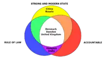 China, India, the Islamic world and Europe each developed these three components of political organization in different order, in different ways and to different degrees. Denmark and the United Kingdom arrived first at a modern balance of the three components in a single package, followed by others by the nineteenth century, as the Netherlands and Sweden.[33]