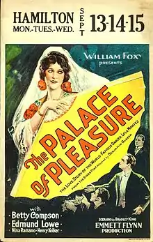 The Palace of Pleasure is a 1926 American silent drama film directed by Emmett J. Flynn and written by Benjamin Glazer and Bradley King. The film stars Betty Compson, Edmund Lowe, Henry Kolker, Harvey Clark, Nina Romano, and Francis McDonald. The film was released on January 10, 1926, by Fox Film Corporation.[1][2][3]