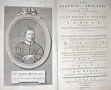 The Pilgrim's Progress from This World, to That Which Is to Come is a 1678 Christian allegory written by John Bunyan. It is regarded as one of the most significant works of theological fiction in English literature and a progenitor of the narrative aspect of Christian media.[1][2][3][4][5][6] It has been translated into more than 200 languages and never been out of print.[7][8] It appeared in Dutch in 1681, in German in 1703 and in Swedish in 1727. The first North American edition was issued in 1681.[9] It has also been cited as the first novel written in English.[10] According to literary editor Robert McCrum, "there's no book in English, apart from the Bible, to equal Bunyan's masterpiece for the range of its readership, or its influence on writers as diverse as William Hogarth, C. S. Lewis, Nathaniel Hawthorne, Herman Melville, Charles Dickens, Louisa May Alcott, George Bernard Shaw, William Thackeray, Charlotte Bronte, Mark Twain, John Steinbeck and Enid Blyton.[11][12] The words on which the hymn "To be a Pilgrim" is based come from the novel.