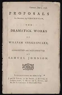 On 1 June 1756, Johnson reprinted his Miscellaneous Observations but attached his Proposal or Proposals for Printing, by Subscription, the Dramatick Works of William Shakespeare, Corrected and Illustrated. On 2 June 1756, he signed a contract to edit an eight-volume set of Shakespeare's writings including a preface, and on 8 June 1756 Johnson printed his Proposal, now called Proposals for an Edition of Shakespeare.[17] The Proposal sold subscriptions for Johnson's future edition at the cost of two guineas, the first paid before and the second upon printing.[18] When Johnson achieved scholarly renown for his A Dictionary of the English Language, Warburton's publishers, Tonson et al., granted him permission to work on Shakespeare.[17]