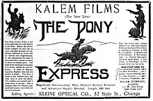 The Pony Express is an American silent fiction film[1] produced by Kalem Company and directed by Sidney Olcott with Sidney Olcott, Robert Vignola and Joe Santley in the leading roles. It was the first movie on Pony Express.[2]