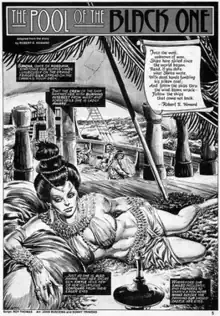 ![]() The opening panel of the comic adaptation of The Pool of the Black One by Roy Thomas featuring the art of John Buscema and Sonny Trinidad. The original short story was written by Robert E. Howard and first appeared in a 1933 issue of Weird Tales magazine. | |||