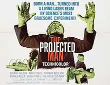 A review in entertainment industry magazine Variety praised The Projected Man, writing that the screenplay "is a mosaic compiled from other films but the pieces hang together fairly well." However, Variety criticised the character's motives, saying that "the origin and motives of the third party are never fully explained." The magazine wrote that the performances in the film were "generally good," and that "the characters do not fall prey to the usual cliches."[13] Writing for Ottawa Citizen, Gordon Stoneham, reviewing the double bill of The Projected Man and Island of Terror, called The Projected Man "dreadful stuff," saying that the film was "badly written, woodenly acted, and abounding in the cliches of the horror film genre." However, he wrote that "it is short and to the point" and wrote that "although it trods a familiar path, every now and then it comes up with some arresting bit of cinematic coloring that rivels the attention." Comparing the two films, he stated that The Projected Man was "the best."[14] A TV Guide review wrote that the "characters are better portrayed than usual in films of this nature, keeping the actors from becoming mere stereotypes" and that "subtle artistic direction and first-quality special effects give this picture a strong visual presence." The review graded The Projected Man with two stars out of four.[15] The anonymous reviewer for the British Kinematograph Weekly called the cast "competent" and noted that, while the "plot [was] at least as old as H. G. Wells", there was something about the film that would challenge the "hard-boiled child of today".[10]