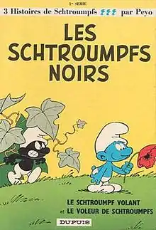 The Purple Smurfs (original French title: Les Schtroumpfs noirs, "The Black Smurfs") is the first album of the original French-language Smurfs comic series created by Belgian artist Peyo. It was first published as an album in 1963, but the stories it contained had already been published in Spirou magazine. The main story Les Schtroumpfs noirs was first published in number 1107 (July 2, 1959) as the first "mini-récit" in the magazine. This was a special supplemental page which readers would remove and fold up in order to create a small booklet. Mini-récits were not included when the issues of Spirou were collected in the quarterly hardcover volumes, so this story is absent from volume 72 of Spirou, though the page containing instructions for creating the booklet is there.[1]