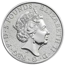 The Queen's Beasts coins are British coins issued by the Royal Mint in platinum, gold, and silver since 2016.[1][2][3][4][5][6][7] Each of the 10 beast coins in the series features a stylized version of one of the heraldic Queen's Beasts statues present at the coronation of Queen Elizabeth II representing her royal line of ancestry. The silver coin is notable as the first two-ounce United Kingdom silver bullion coin.[1] Engraver Jody Clark designed the entire series.[1] In December 2016, a full line of proof-quality coins was announced.[8] In 2017, the mint began producing a platinum version of the coin. In April 2021, the Royal Mint issued an eleventh "Completer Coin" that featured all 10 of the Queen's Beasts, taking the series to 11 coins in total. The April 2021 release included a "one of a kind" gold coin weighing 10kg and a denominated value of £10,000. Based upon the UK spot price at the time of release, the 10kg gold coin had an intrinsic scrap value of approximately £411,000. It was widely reported that the 10kg gold coin was the heaviest gold coin the Royal Mint had ever produced and that it had taken 400 hours to produce, four days to polish and has been described as a "Masterwork". The Royal Mint announced that Completer Coin completes the Queen’s Beasts commemorative collection.[9]