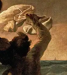 Among the scenes he considered were the mutiny against the officers from the second day on the raft, the cannibalism that occurred after only a few days, and the rescue.[37] Géricault ultimately settled on the moment, recounted by one of the survivors, when they first saw, on the horizon, the approaching rescue ship Argus—visible in the upper right of the painting—which they attempted to signal. The ship, however, passed by. In the words of one of the surviving crew members, "From the delirium of joy, we fell into profound despondency and grief."[37]
