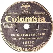 "The Rain Don't Fall on Me" is a gospel blues song recorded in 1929 by Blind Willie Johnson (vocals and guitar) and Willie B. Harris (vocals), who is thought to have been his first wife.[1]