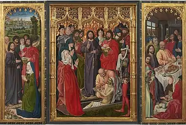 The central panel shows the resurrection itself, with one side panel showing Christ welcomed by Lazarus' sisters Mary and Martha and the other showing Christ's feet being washed in the house of the Pharisee. When closed, the side panels show portraits of the work's commissioner Francesco Coppini (bishop of Prato and papal legate to pope Pius II in Flanders and England) praying with two of his servants before an image of the Madonna and Child. The work is also signed Nicolaus Frumenti absolvit hoc opus XV HL. Junii MºCCCCºLXI on the exterior. It remains in its original Flemish-style frame with a set of light gilded arches inspired by the arcades of Gothic architecture seen in French cathedrals of the time.