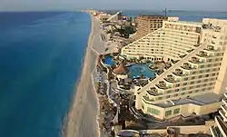 The cast stayed at the ME Cancun resort (now called Melody Maker Cancún)[8] at Boulevard Kukulkan, km. 12 in Cancun, Mexico. The resort is located in the hotel zone between the Beach Palace and Park Royal Piramides resorts. Fifteen hotel rooms were converted into the cast's suite: eleven on the second floor, and four rooms on the third floor. Production Designer Chuck Aubrey used the hotel's signature furnishings to decorate the suite, along with the vivid colors that are typically used by the Real World production to adorn the residences. The suite, like all of the resort's other 418 rooms, features an ocean and sunset lagoon view. The suite is currently available to the public under the name SuiteMe.[9][10] The suite was later used as the vacation residence for the cast of the 2011 Las Vegas season, as seen in Episode 11 of that season.[11]