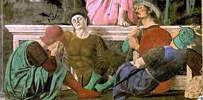 The guard holding the lance is depicted sitting in an anatomically impossible pose, and appears to have no legs. Piero probably left them out so as not to break the balance of the composition.[6]