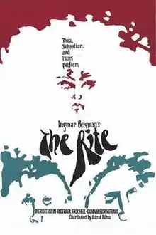 The Rite (Swedish: Riten) is a 1969 Swedish drama film written and directed by Ingmar Bergman. It premiered on Swedish television on 25 March 1969.[1] Actors Thea (Ingrid Thulin), Sebastian (Anders Ek) and Hans (Gunnar Björnstrand) are sequestered in the offices of Judge Abrahamson (Erik Hell), who questions them about the play they have been performing, which has been accused of being obscene. As the judge interviews them separately and together, the three performers work through their considerable psycho-sexual baggage with each other, while collectively laying siege to the sensibilities of their authoritarian interrogator.
