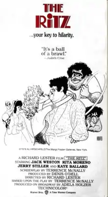 The Ritz is a 1976 British-American comedy farce film directed by Richard Lester based on the 1975 play of the same name by Terrence McNally. Actress Rita Moreno – who had won a Tony Award for her performance as Googie Gomez in the Broadway production – and many others from the 1975 original cast, such as Jack Weston, Jerry Stiller, and F. Murray Abraham, reprised their stage roles in the film version. Also in the cast were Kaye Ballard and Treat Williams. The film, Jack Weston, and Rita Moreno all received Golden Globe nominations in the comedy category. It opened to mixed reviews.