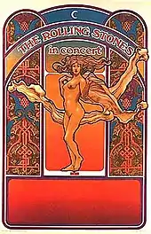 Tour manager Sam Cutler introduced the Rolling Stones as "the greatest rock and roll band in the world", a title he had first bestowed upon them at their concert in London's Hyde Park the previous July.[10] The tour set lists were derived mostly from 1968's Beggars Banquet album and the forthcoming Let It Bleed. The performance itself featured the Stones showmanship that would become familiar: Charlie Watts businesslike drumming leavened by an occasional wry smile, Bill Wyman's undertaker persona on bass, the guitar interplay of Mick Taylor with Keith Richards, and most of all Mick Jagger's prancing, strutting, leering and preening in front of the crowd.[5][8] "Ah think I've busted a button on my trousers, I hope they don't fall down" he teased the audience. "You don't want my trousers to fall down, now do ya?"[11] At one point in some shows, Jagger motioned for the audience to rush past ushers to the edge of the stage;[7] of the group's reaction to the crowd's fervor, a spokesman said, "They loved it."[7]