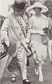Beatrice was born in London in 1866. Her father was the Hon. St. Leger Richard Glyn and her grandfather was George Glyn, 1st Baron Wolverton. In 1888 she married Frederick and the couple had two daughters. She and Frederick appear to have been highly regarded by the Royal Family and were invited to many social functions. They lived for some years at Royal Lodge in Windsor Park as a gift of the royal family. The King also seems to have valued Beatrice’s opinions on thoroughbred horses as several letters exist from him to Beatrice in which he thanks her for advice about breeding.[11] After her husband’s death she continued to buy horses for him at Newmarket for his stud at Sandringham.[12] She was also a close friend of Queen Mary[13] and on many occasions The Queen came to visit her for lunch at the Rosery.[14] On some occasions the Queen brought her daughter in law Queen Elizabeth (later the Queen Mother).[15] She is shown in the photo walking with Princess Mary who also befriended her.