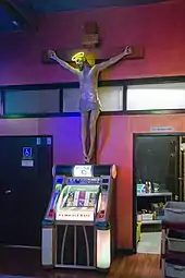 The Roxy was a diner on Southwest Harvey Milk Street in downtown Portland. The restaurant's small storefront neighbors were the gay bar Scandals and a residential hotel.[1][2] The Roxy served American cuisine,[3] including breakfast all day,[4] and was described as having a "funky avant-garde theme".[5] The interior featured a jukebox and a sculpture of Jesus.[1] Depictions of nude women appeared on an overhead mirror.[6] Prior to the COVID-19 pandemic, the diner was open 24 hours a day,[5][7] except on Mondays.[6][8] Scandals patrons could order food from The Roxy and consume from inside the bar.[9][10]