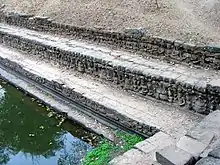 The 5625 square meters pond, probably built by king Jayavarman VIII, is faced with sandstone around its circumference. 13 tiers of steps descend 5.32 meters to the laterite paving. A wall was built on the south and to a lesser extent on the west which probably retain the embankment that extends to the pond from Phimeanakas. Dominating the pond on top of the wall is a paved terrace.