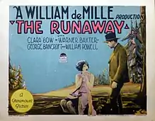 The Runaway is a 1926 American silent film melodrama directed by William C. deMille and starring Clara Bow, Warner Baxter, William Powell, and George Bancroft. The plot involves a movie star who erroneously assumes that she has murdered someone and flees to Kentucky. The cinematography was by Charles P. Boyle.[1][2]