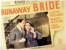 The Runaway Bride is a 1930 American pre-Code crime film starring Mary Astor, Lloyd Hughes, and Paul Hurst. It was directed by Donald Crisp, from a screenplay by Jane Murfin, adapted from the play Cooking Her Goose by H. H. Van Loan and Lolita Ann Westman.[5]