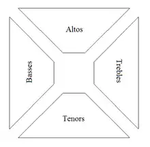 Sacred Harp groups always sing a cappella, that is to say, without accompanying instruments.[3][4] The singers arrange themselves in a hollow square, with rows of chairs or pews on each side assigned to each of the four parts: treble, alto, tenor, and bass. The treble and tenor sections are usually mixed, with men and women singing the notes an octave apart.
