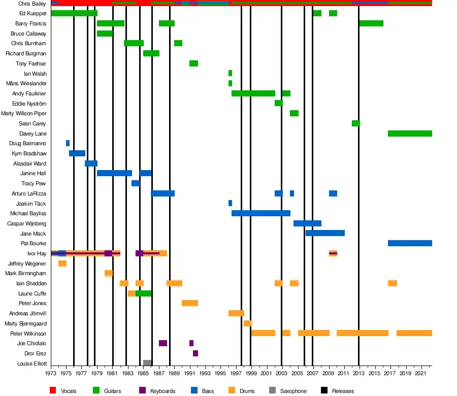 - Chris Bailey – lead vocals (1973–2022; died 2022), guitar (1980–1983, 1984–1986, 1989–1990, 1991–1996, 1996–2012, 2016–2022), bass (1973–1974, 1989–1996, 2012–2016)