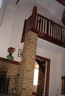 The front of the house has a pitched roof with the ridge parallel to the front of the house (approximately northeast – southwest). Roof ridge lines are in blue dashes in the layout diagram. The former school room is behind the front rooms and takes the entire width and height of the building, with a second roof ridge being almost the same height as the ridge of the roof over the front rooms, but is perpendicular to the front ridge, therefore approximately north west – south east. The ridge for the roof of the school room is located approximate one third along the width of the building, closest to the southern end of the school room. This means the school room has a very high ceiling (two storeys plus attic at the ridge point). Within the vaulted ceiling the wooden roof joists and trusses become a feature of the room. From the ridge the ceiling followed the roof line downwards until it met the external walls, at a height of approximately four metres (13 ft) on one side and two metres (6 ft 7 in) at the rear of the school room (north side of the building). This gave the rear of the building an asymmetric gable end view.