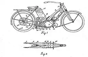 Scott designed and patented a vertical twin two-stroke engine in 1904,[4] and patented the familiar Scott motorcycle frame in 1908[5] designed to accept an engine of the type in the former patent and to achieve a low centre of gravity. The resulting motorcycle was launched in 1908 featuring a 450 cc two-stroke twin-cylinder water-cooled engine. Innovative features included a patented two-speed chain transmission[6] in which the alternative ratios were selected by clutches operated by a rocking foot pedal and a kick start also patented.[7] The first few machines to his design were produced by Bradford-based car firm Jowett in 1908 and soon after he set up as a manufacturer in his own right at the Mornington Works, Grosvenor Road, Bradford.[1]