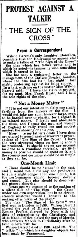- Protest Against a Talkie: "The Sign of the Cross", The Citizen, (Tuesday, 31 January 1933), p.8.