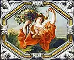 A woman, crowned with fruit, holds in one hand a cornucopia filled with grapes, symbolizing the month of the grape harvest. In the other hand she holds a balance, a reference to the return of the equality of days and nights at the time of the autumnal equinox on 22 September.[2]