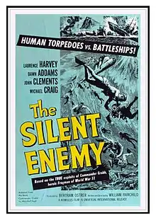 The Silent Enemy is a black and white 1958 British action film directed by William Fairchild. It stars Laurence Harvey as Lionel "Buster" Crabb and describes his exploits during World War II. Based on Marshall Pugh's book, "Commander Crabb", the film followed the publicity created by Crabb's mysterious disappearance and likely death during a Cold War incident a year earlier. It was the first Universal Pictures film in SuperScope.