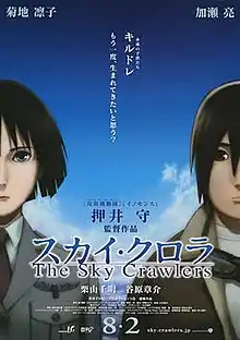 The Sky Crawlers (スカイ・クロラ, Sukai Kurora) is a 2008 Japanese animated war film, directed by Mamoru Oshii. It is an adaptation of Hiroshi Mori's novel of the same name. It was released across Japanese theatres by Warner Bros. Japan on August 2, 2008.[2][3][4] Animated by Production I.G, the film was written by Chihiro Itō, featuring character designs by Tetsuya Nishio and music by Kenji Kawai.[2][3] The 3D CG animation for the movie was produced by the Polygon Pictures studio, who also produced the 3D CG for Oshii's previous film Ghost in the Shell 2: Innocence.