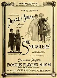 The Smugglers was 1916 American silent comedy film produced by Famous Players Film Company and distributed through Paramount Pictures. It was directed by Sidney Olcott and starred stage star Donald Brian in his second film.[1][2] The film is now considered lost with only a fragment (part of reel 2) surviving at the Library of Congress.[3]